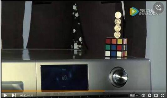 直观视频演示,在运转的洗衣机上竖立叠放4枚5角硬币。