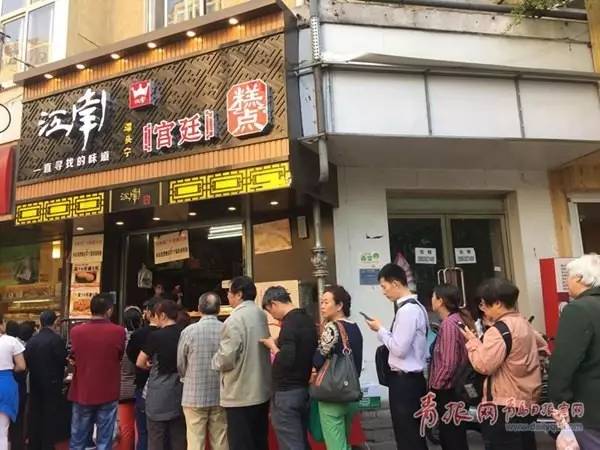 27日上午,受到“棉花肉松蛋糕”事件影响的江南宫廷糕点店经过关门修整后重新开业,通过免费送蛋糕的方式答谢广大顾客支持,并在店门口张贴出官方发布肉松蛋糕洗出棉花不实的辟谣信息为肉松蛋糕正名,等待购买蛋糕的市民排起了长队。