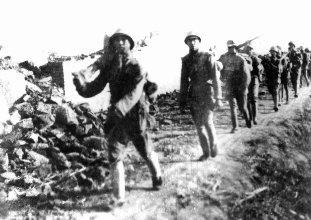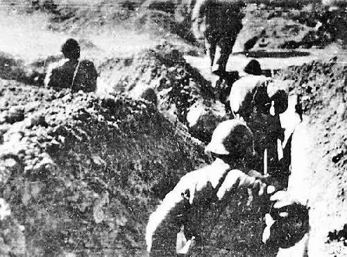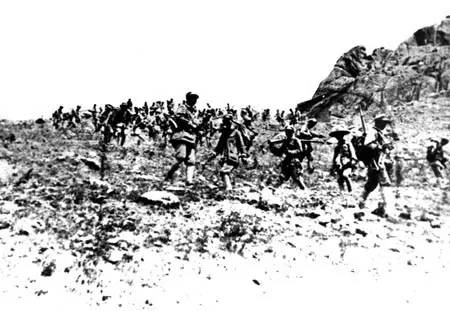 警四旅战士攻击五龙南山敌军阵地。