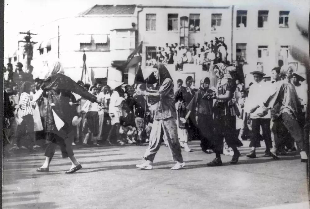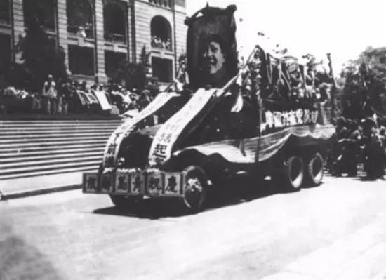1949年6月15日,青岛庆祝解放大游行举行,全市10余万人参加了庆祝解放游行大会。图为游行彩车通过市政府门前。