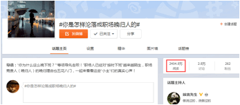 在早高峰时段,微博话题#你是怎样沦落成职场晚归人的#话题一跃登上一小时微博话题热门排行榜第4位,更被首页右侧轮播榜成功收录,引发2400万+人次网友关注,超过2.8万次网友参与了话题讨论,其中也不乏有蓝V主动参与话题“蹭热度”的现象。