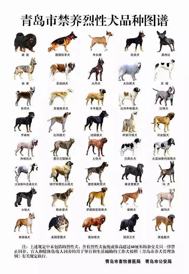 有关部门在广泛征求社会意见的基础上,组织专家确定了烈性犬名录,居民不得饲养名录中规定的烈性犬。居民每户限养一只犬,《青岛市养犬管理条例》施行前已依法办理犬只免疫登记的,不受此数量限制。