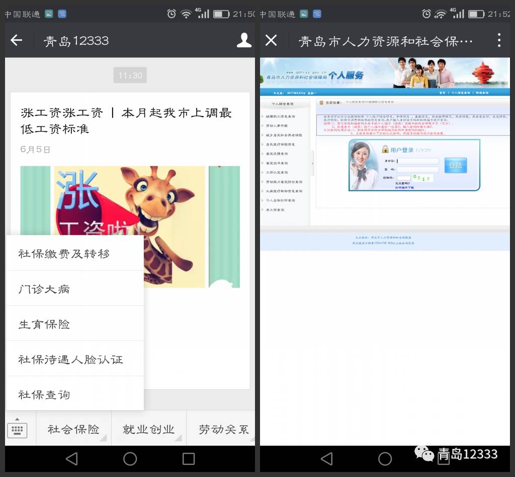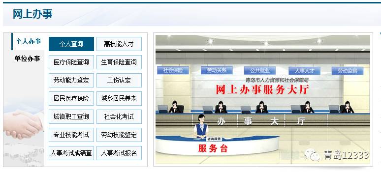 关注“青岛12333”微信公众号后,在公众号标签中选择社会保险——社保查询。