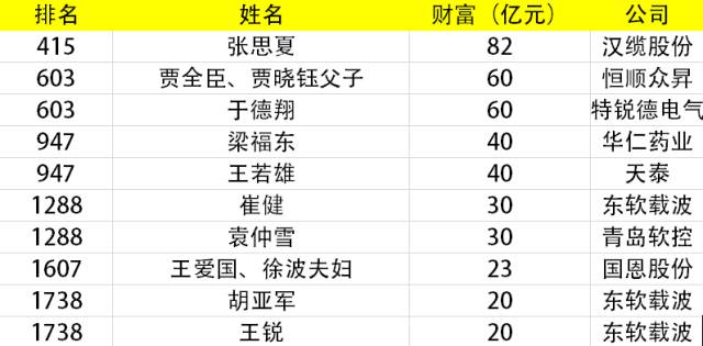 | 603 | 贾全臣、贾晓钰父子 | 60 | 恒顺众昇 | 机电设备制造、发电、投资 | 山东青岛 | 59、31 |