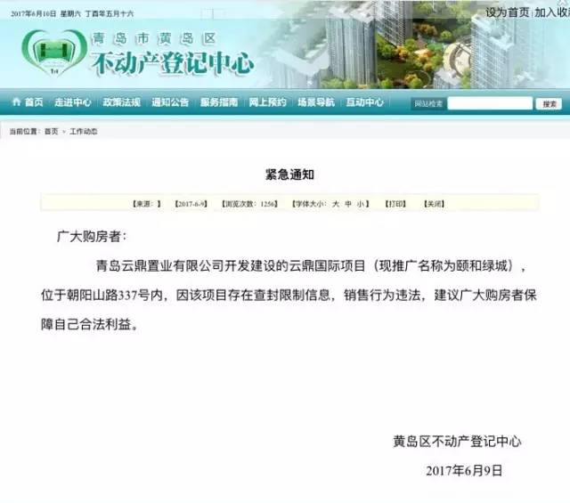 由青岛云鼎置业有限公司开发建设的云鼎国际项目(颐和绿城)存在查封限制信息,销售行为违法。