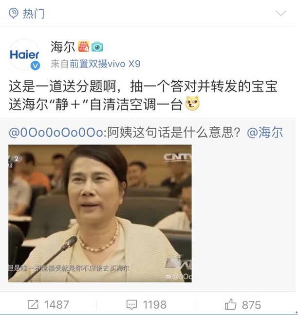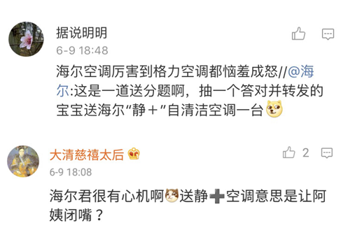 董明珠略带挑衅意味的言论被网友发现,网友@0Oo0oOo0Oo 发微博并@海尔问:阿姨这句话是什么意思?身为八十万蓝V总教头的海尔君怎么可能沉默,这不,机智的海尔君面对这番言论不是怒而怼之,而用轻松愉悦的回复、采取网友互动的形式巧妙转发:这是一道送分题啊,抽一个答对并转发的宝宝送海尔“静+”自清洁空调一台。