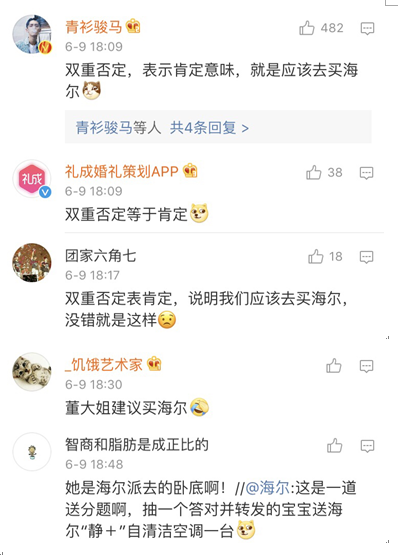 不少网友也迅速Get到海尔的亮点以及阿姨这番言论的漏洞,纷纷留言转发:双重否定表示肯定,这就意味着阿姨叫大家去买海尔!这些网友是不是刚高考完,这语言天赋也是没谁了。让笔者觉得更厉害的是,海尔君寥寥数字,就能发现亮点并进行毫无痕迹的用户引导,成功的把原本不赞同买海尔的语句,转化成了只能买海尔!并且是格力董明珠鼓励大家买海尔!海尔用对手的漏洞为自己打了一出堪称典范的免费广告,并巧妙的结合高考热点,这文案能力、这广告说服力也是服了!