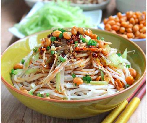 10、和面条,蛋丝拌在一起,吃的时候撒花生碎即可。