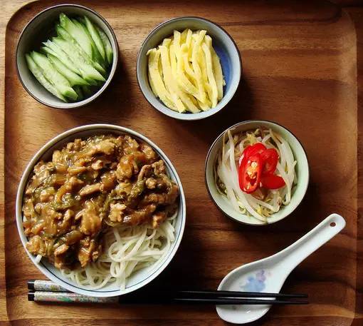 8.煮锅加水,大火烧开,下手擀面,煮开煮熟透,捞起装碗,把菜码排好,把炸酱浇上即可