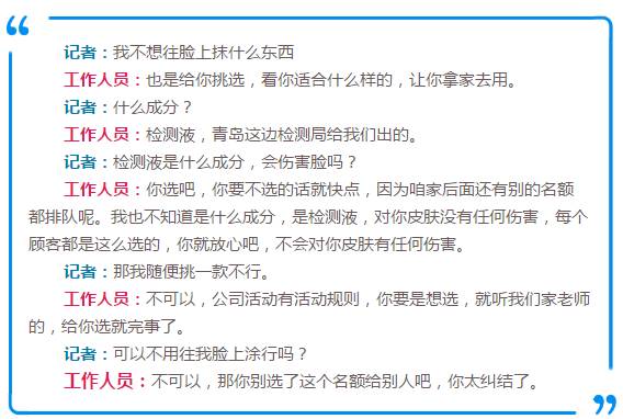 工作人员表示要往记者脸上抹“真皮检测液”▼