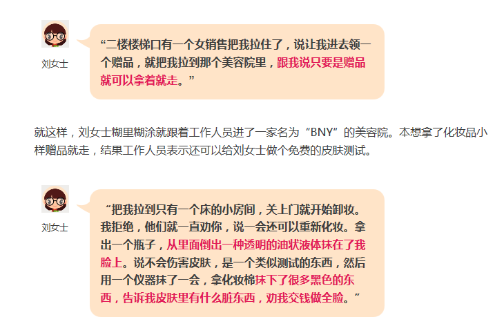 这段台词听上去和刘女士当时的遇到的美容院工作人员说的话如出一辙。记者随后跟随这名男子来到他所说的新店,果然就是那家叫做“BNY”的美容院。一名身着美容院工作服的年轻女子把记者拉到一旁,表示要帮忙选一款适合记者皮肤的赠品。