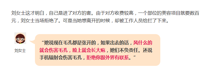 就在刘女士犹豫要不要离开的时候,美容院的工作人员又继续劝说她做脸部美容项目。最后不堪其扰的刘女士坚持离开了美容院,但是回家之后,她就感到脸部不适,一直持续了好几天。