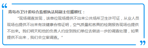 经过调查执法人员了解到,这家美容院的全名叫柏霓雅女子专业SPA养生会所。可是这家号称专业的养生会所却并不专业,不但没有卫生许可证,在场所有的美容师也都拿不出健康证。负责人解释说,健康证都有,但是都没带。