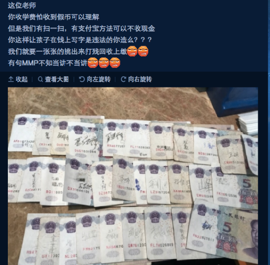 小时候交学杂费时,你有没有在钱上写上自己的名字?你也许会觉得这种略显“不信任”的方式,不存在于街头小摊贩都采用移动支付的现在。事实上,仍有学校采用这种粗暴的方式防止假币。前几天,一位银行工作人员就在微博上晒出了一堆写着名字的5元纸币,称“你这样让孩子在钱上写名字是违法的你造么?”,还表示这些钱都需要“打残回收上缴”。