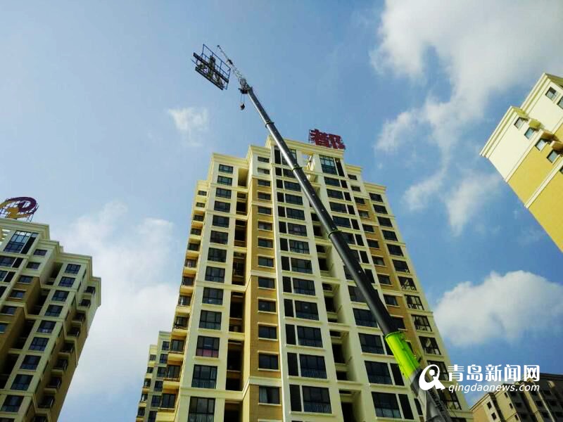 平度市东阁街道执法中队启用百吨级大型吊车对平都壹号院楼顶广告字进行拆除