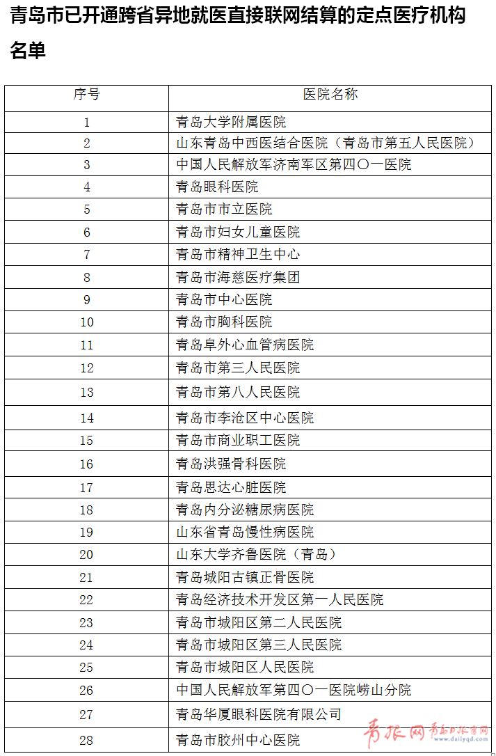 根据人社部、财政部联合印发的《关于做好基本医疗保险跨省异地就医住院医疗费用直接结算工作的通知》,青岛于去年12月全面启动跨省异地就医直接联网结算工作。