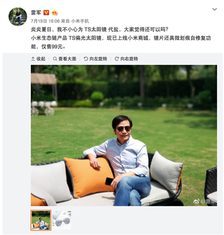 7月19日雷军微博晒出了一张戴太阳镜的照片:“炎炎夏日,我不小心为 TS太阳镜 代盐,大家觉得还可以吗?小米生态链产品 TS偏光太阳镜,现已上线小米商城,镜片还具微划痕自修复功能,仅售99元。 ”