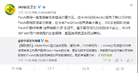 Adobe宣布放弃Flash后,这支烫手山芋将由谁接手成了最热门的话题。日前,360安全卫士公开发布微博表示,将持续为Flash用户提供安全保障,直至其彻底退出历史舞台。在Flash安全研究领域,360无疑是最有发言权的安全厂商。迄今360已协助Flash修复上百个安全漏洞,是国内唯一获得Flash漏洞致谢“破百”的厂商。有了360的承诺,用户无需再为Flash的安全性担忧。