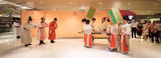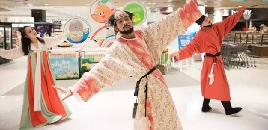 一群帅哥美女身着唐朝服饰在青岛海信广场,突然开启《超级玛丽》群舞快闪,上上下下,左左右右,前进倒退,everybody跟着音乐跳起来!这个画面如果不告诉您,您肯定突然感觉自己穿越到了唐朝!
