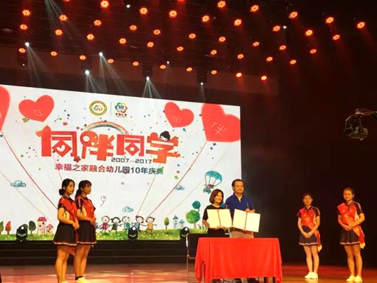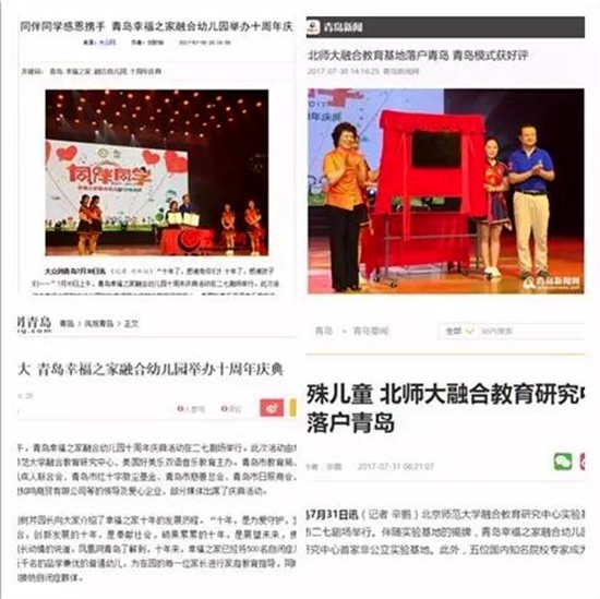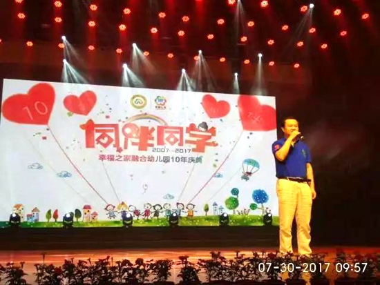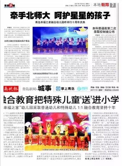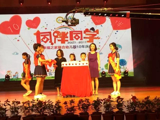 7月30日上午,青岛幸福之家融合幼儿园十周年庆典活动在二七剧场举行。此次活动由幸福之家融合幼儿园和北京师范大学融合教育研究中心主办。青岛市残疾人联合会、青岛市教育局、青岛市红十字会、市北区政府、市北区教育局、市北区残联、即墨路街道办事处、青岛市红十字会微尘基金、青岛市红十字会玫瑰基金、青岛市慈善总会爱基金、青岛市日照商会、好美乐双语教育、青岛颐中皇冠假日酒店、万达艾美酒店、万科集团、青岛欣合荣威4S店、青岛福彩、啄木鸟教育、青岛英伟节节高架业、鲜健知鸣商贸有限公司、青岛海纳德电气有限公司、青岛电视小记者进修学校、青岛电视台、青岛新闻网、青岛早报、青岛晚报、大众网、凤凰网、齐鲁网等诸多媒体出席了庆典活动。