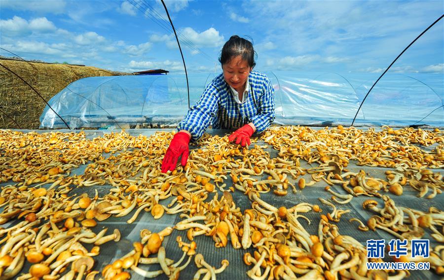 阿里河镇昆仑山村村民吕小艳在晾晒滑子菇(6月29日摄)。