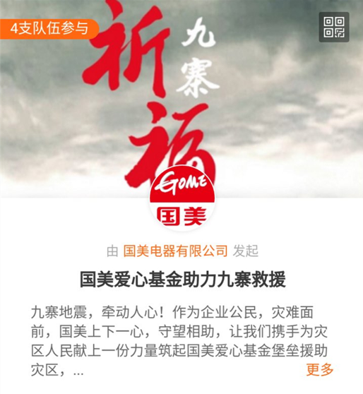 为了应对救灾及灾后重建工作,国美发起“九寨沟地震救援一起捐”公益筹款行动,并通过国美官方微博、国美公益微信和国美官网发布,进行爱心捐款,集社会各界力量帮助灾区群众渡过难关。