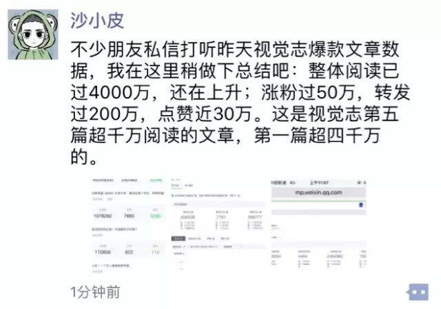 据“视觉志”创始人沙小皮回忆,此前“视觉志”阅读量最高的文章应该是《你没教养的样子真丑》,阅读量1400万左右。