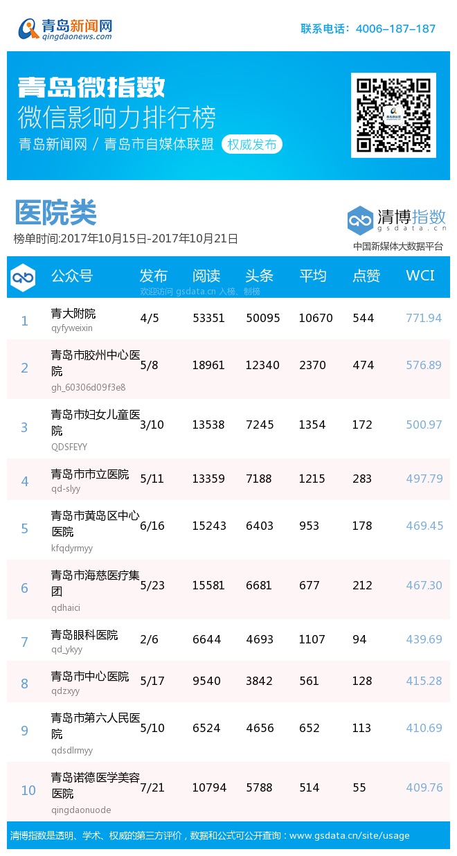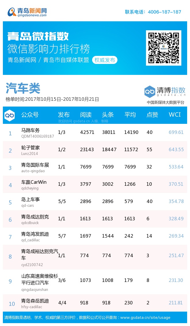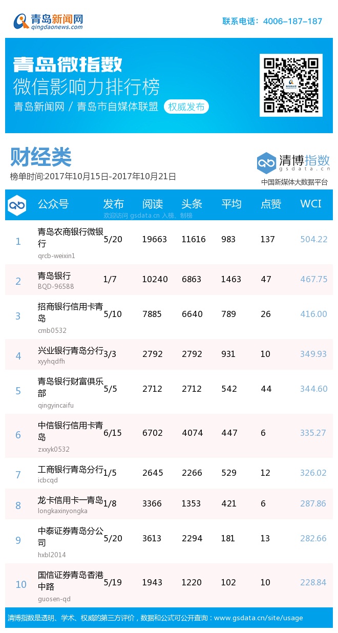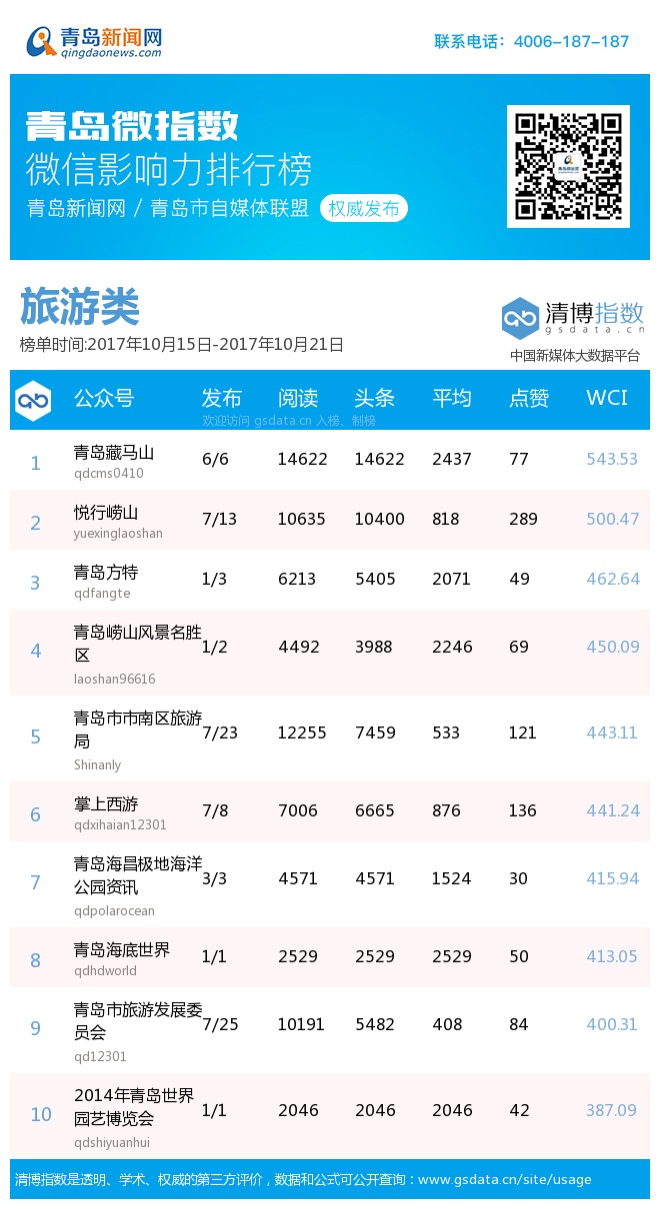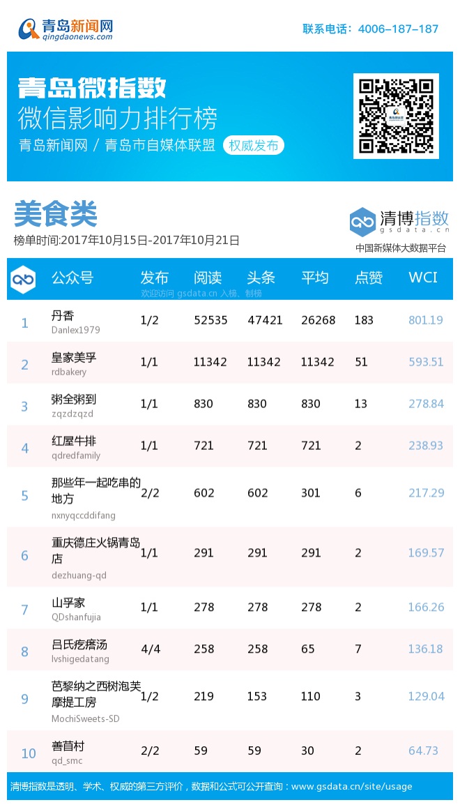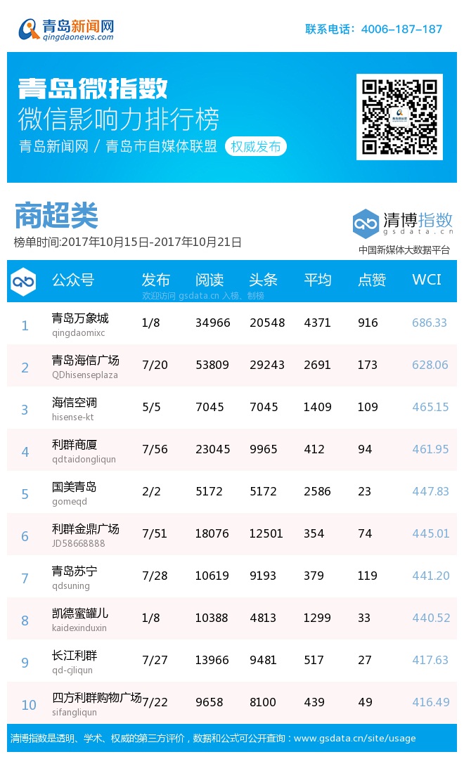 3、本次榜单收录了青岛13个行业微信公众号,如您的账号暂未收录,可联系4006-187-187。