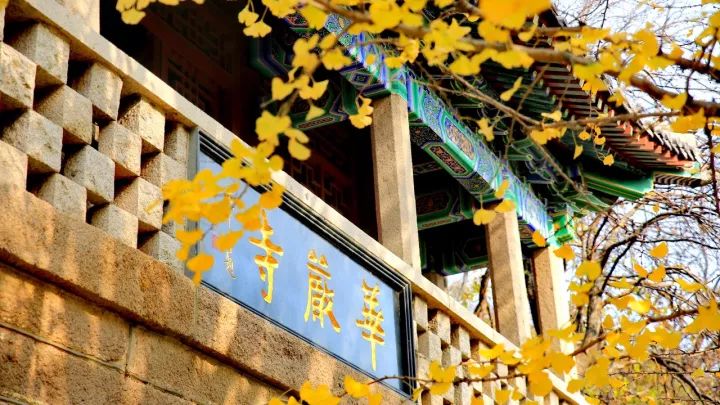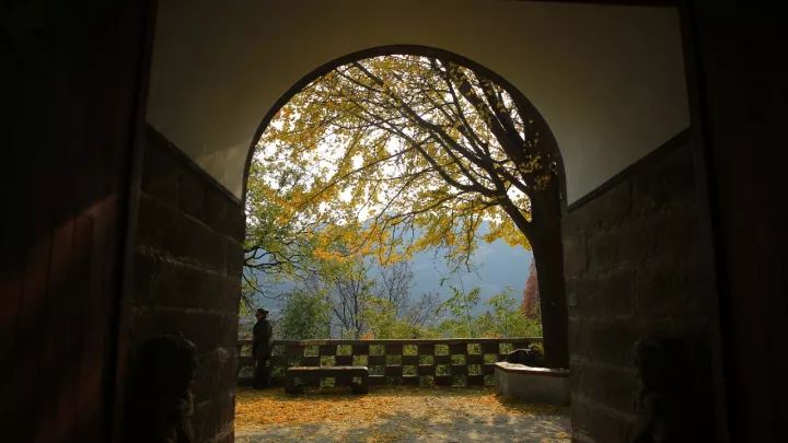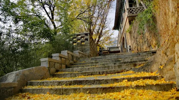 与城市里现在满目萧条的景色相比,这个季节还能欣赏到金黄的银杏,确实给人一种错觉,也让人不由得理解了那句“人间四月芳菲尽,山寺桃花始盛开”,就像如今这山寺的银杏满地金黄,也是要晚于“人间”的。
