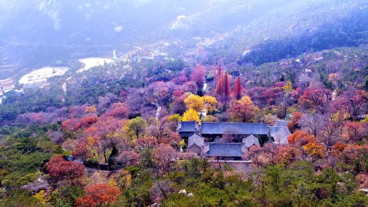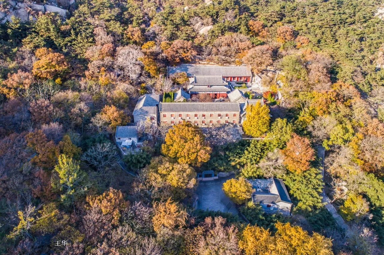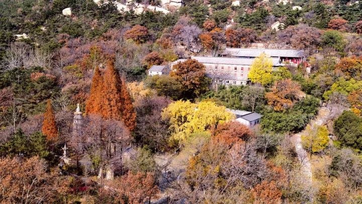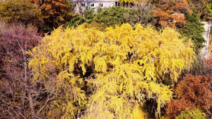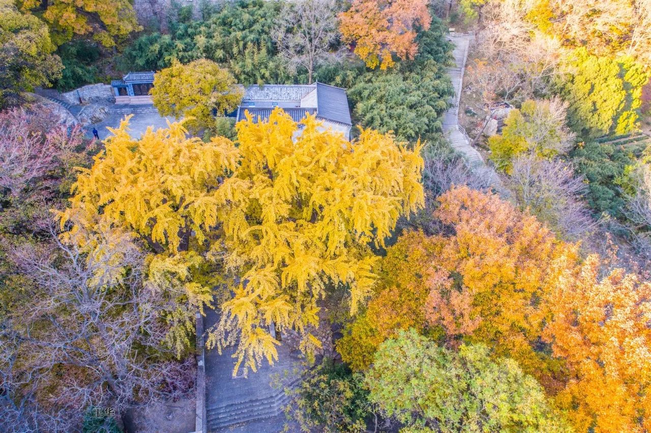 △航拍下的华严寺,银杏极为耀眼,与层林尽染的环境相得益彰。