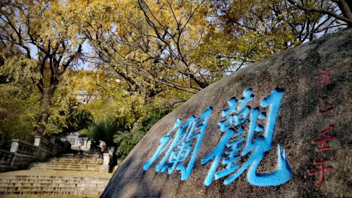 塔院对门,有一石刻近一米,上面“观澜”二字十分醒目,也正应了此处的风景,透过石后的林间,便可远望东海碧涛,潮起潮落尽收眼底。