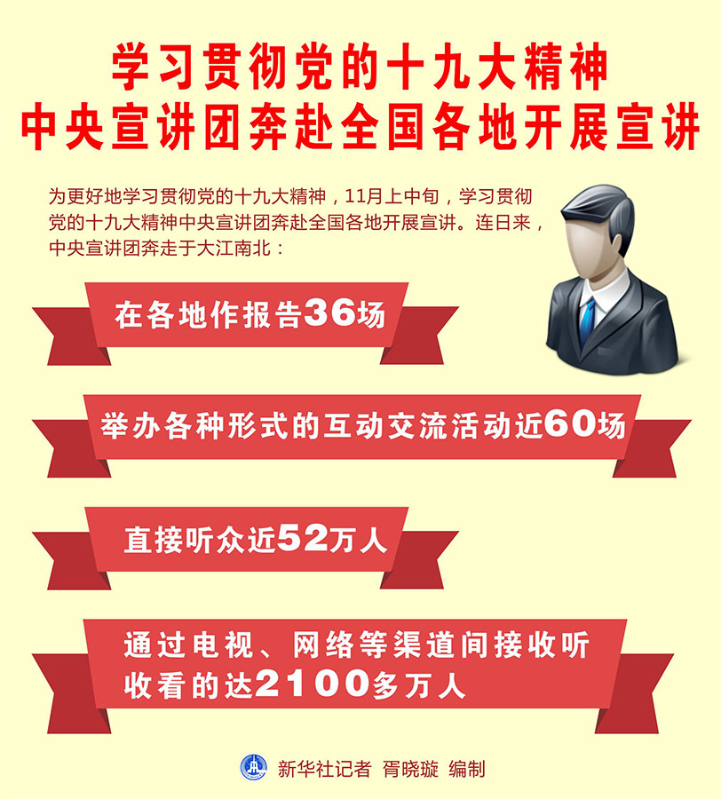为更好地学习贯彻党的十九大精神,11月上中旬,学习贯彻党的十九大精神中央宣讲团奔赴全国各地开展宣讲。连日来,中央宣讲团奔走于大江南北,在各地作报告36场,举办各种形式的互动交流活动近60场,直接听众近52万人,通过电视、网络等渠道间接收听收看的达2100多万人。