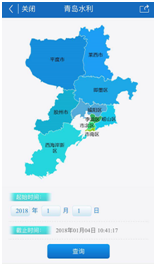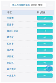 在“青岛水利”页面中的“青岛雨情图”,可以选择任意起始时间,查看该时间到目前的“青岛各区市动态时段雨情图”,颜色由蓝到绿代表雨量的不断增多。除了直观的地图,下方还有“青岛市雨量数据表”,让你通过直观的平均雨量数据了解青岛各区市这段时间内的降水情况。