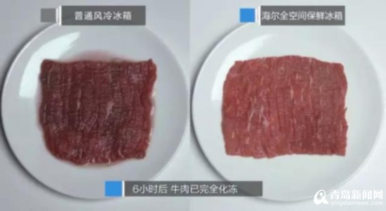 在看到普通风冷冰箱中的牛肉解冻后流血水、弹性消失,而海尔全空间保鲜冰箱中的牛肉无血水流出、保持原有弹性弹起弹珠的巨大差异后,用户纷纷对海尔冰箱竖起大拇指。