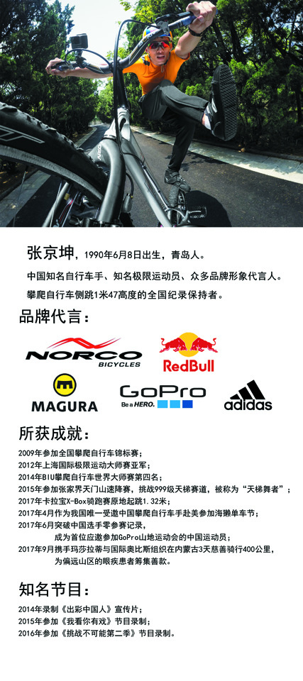 皮肤黝黑,笑容真诚,活力阳光,这就是极限运动员张京坤。他是攀爬自行车全国纪录保持者,同时热衷公益,在青年群体中具有极高的号召力。
