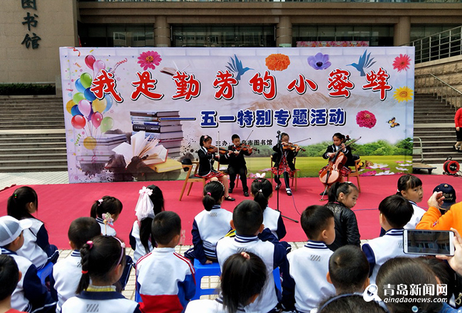 参观结束后,小朋友们在北广场欣赏了精彩的文艺节目,儿童小提琴齐奏《儿歌串烧》、小合唱《夕阳红》、朗诵《劳动者的日子》、吕剧小合唱《唱支山歌给党听》等节目先后亮相,演出精彩纷呈、引人入胜,引得众多读者纷纷驻足欣赏。