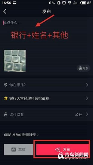Step4.根据自己的喜好对视频进行加工处理,并发布。在发布界面“说点什么....”中统一按“银行+姓名+其他(介绍或宣言或其他想说的话)”填写,点击发布按钮。发布成功即为参赛。