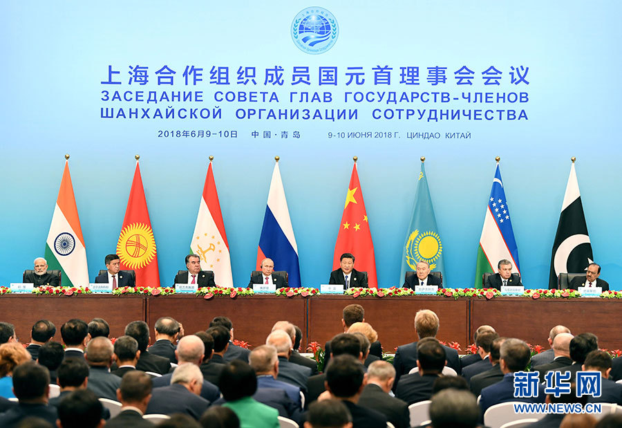 6月10日,上海合作组织成员国领导人共同会见记者。国家主席习近平作为主席国元首发表讲话。印度总理莫迪、哈萨克斯坦总统纳扎尔巴耶夫、吉尔吉斯斯坦总统热恩别科夫、巴基斯坦总统侯赛因、俄罗斯总统普京、塔吉克斯坦总统拉赫蒙、乌兹别克斯坦总统米尔济约耶夫出席。新华社记者 燕雁 摄