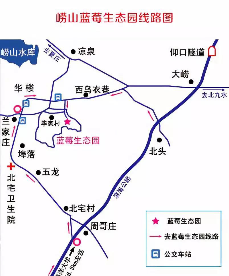 青岛市区→滨海公路→地铁11号线北宅站附近左转→毕家村右转→崂山蓝莓生态园