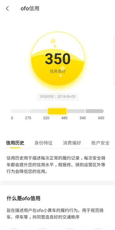 ofo相关负责人介绍称,用户在注册ofo后,每个人的初始分值为270分,此后根据个人用车行为增减分数得到综合评分,保持规范的骑行习惯即可加分,反之,违反交通规则,破坏车辆等行为则会被扣除相应的分数。该评分每月更新一次,最高分为600分。老用户的历史信用积分将纳入新版信用体系中。