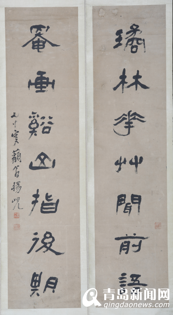 此联创作时间约为1889年。上联书“璚林花草闻前语”,右下钤“杨石头”朱文印;下联书“罨画溪山指后期”落款“七叟藐翁杨岘”,下钤“臣显大利”白文印、“藐翁”朱文印各一。书法遒劲苍健,堪称杨岘晚年隶书中代表作品。