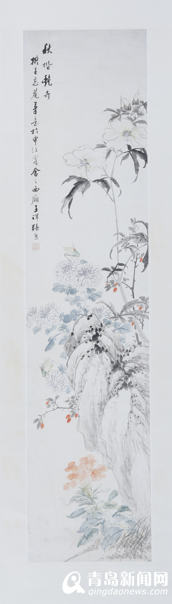 此轴下端为红艳的鸡冠花,巨石上,紫菊盛开,一上一下两只纺织虫匍匐其间,一株秋葵挺拨而上,顶端两花蕊含苞欲放,两朵盛开着,香气外溢。画面清秀,设色浓艳,生趣盎然,其纵逸近似周之冕(少谷),又得王武(忘庵)古媚之趣。左上题“秋阶艳卉,拟王忘庵笔意于申江客舍之西厢,子祥张熊”,下钤朱文“子祥”印一方。