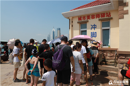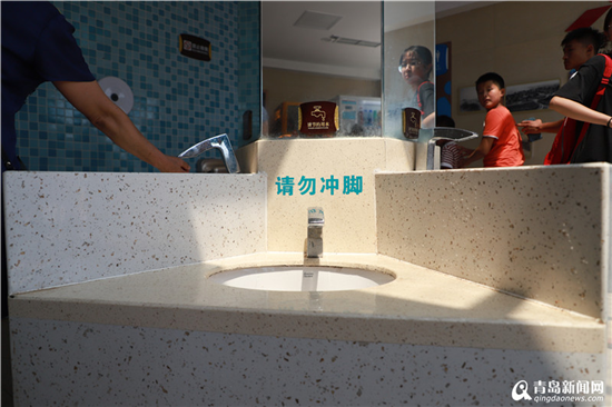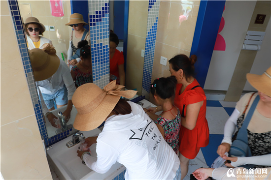 此时冲脚池排起了长队,记者发现,一位父亲正招呼自己的孩子到末尾排队,谈到游客在洗手池冲脚的问题,这位来自内蒙古的游客说:“这是很不文明的行为,既然设置了专门冲脚的区域,就应该到这里来,而且我也希望我的孩子能够养成文明的好习惯,青岛是一个很好的城市,希望这种不文明现象能够得到有效制止。”从天津来青旅游的侯先生正带着自己的孩子在东厕门口冲脚,他也表示,在洗手台冲脚是个人素质的问题,这种行为很不值得提倡。