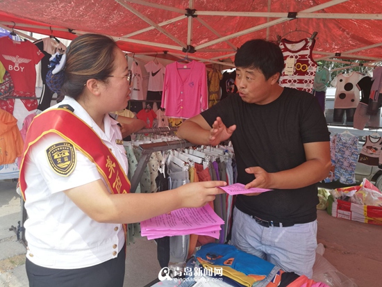 身披绶带的换乘站职工放弃休班,走进集市摊点,发放旅游宣传单,赢得村民好评。