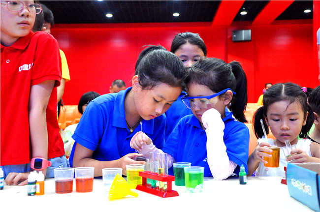 孩子们在老师的指导下做趣味实验。