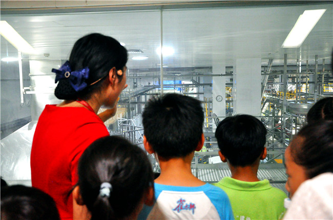 孩子们在志愿者的引导下参观可口可乐生产线。
