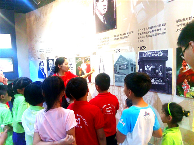 志愿者在给孩子们讲解可口可乐的故事。