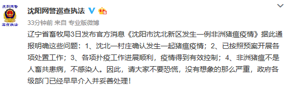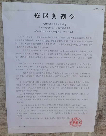 今日(3日),一张内容为“沈阳市沈北新区人民政府发布的疫区封锁令”的照片在网络上热传,引起多方关注。下午,辽宁省畜牧局发布官方消息,证实沈北新区确发生一例非洲猪瘟疫情,各项扑疫工作进展顺利,疫情得到有效控制。