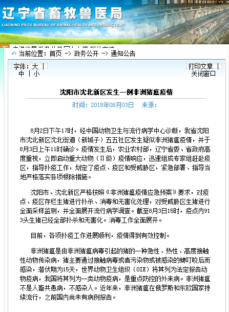 通报中称,8月2日下午17时,经中国动物卫生与流行病学中心诊断,辽宁省沈阳市沈北新区沈北街道(新城子)五五社区发生疑似非洲猪瘟疫情,并于8月3日上午11时确诊。疫情发生后,农业农村部,辽宁省委、省政府高度重视,立即启动重大动物(Ⅱ级)疫情响应,迅速组成专家组赶赴疫区,指导扑疫工作,划定了疫点、疫区和受威胁区,紧急部署、指导当地严格落实各项根除措施。