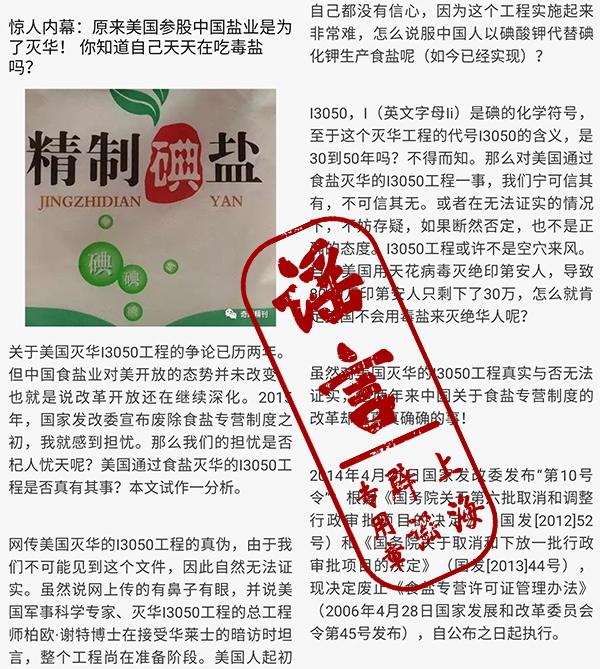解放日报·上观新闻记者仔细阅读这篇网传文章后发现,网文语出惊人,提出了数个让人细思恐极的观点:中国食盐“碘强化”使用碘酸钾而不是碘化钾,危害健康,这是“美国人的阴谋”;碘酸钾属于危险化学品;过量补碘可能“致甲状腺癌”;盐加碘酸钾背后是一个绝密的“I3050工程”,而这个工程的总工程师柏欧·谢特博士疑似在向中国网民发出警告的过程中遭到暗杀。